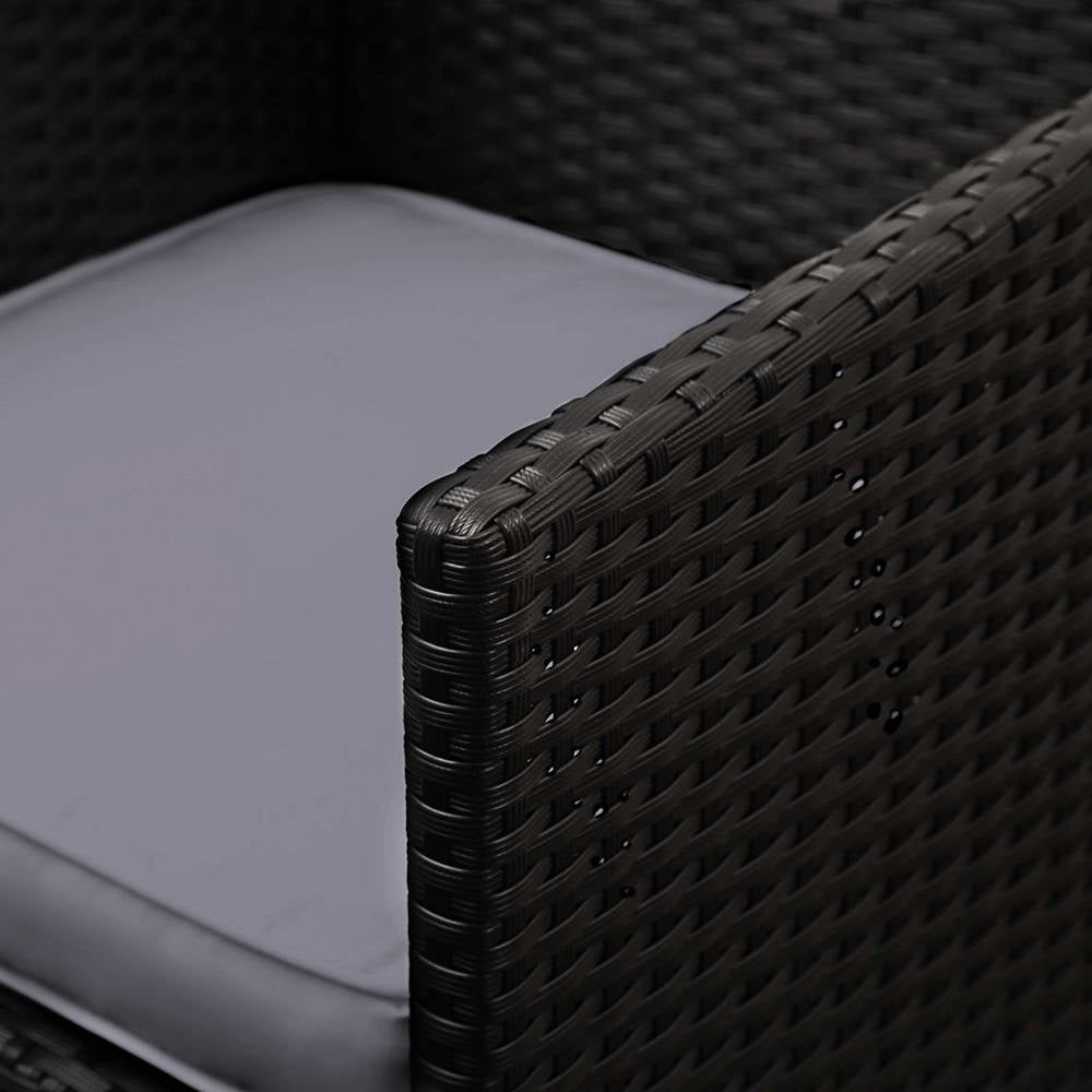 Crafted with a powder-coated steel frame and wrapped in UV-resistant PE wicker, it ensures weather-resistance and year-round durability. The 5mm tempered glass tabletop provides a sleek, safe surface for meals and drinks. Each seat is cushioned with 5cm thick high-density foam and features 8cm thick back cushions – both with zipped covers that are removable and washable for easy maintenance.
