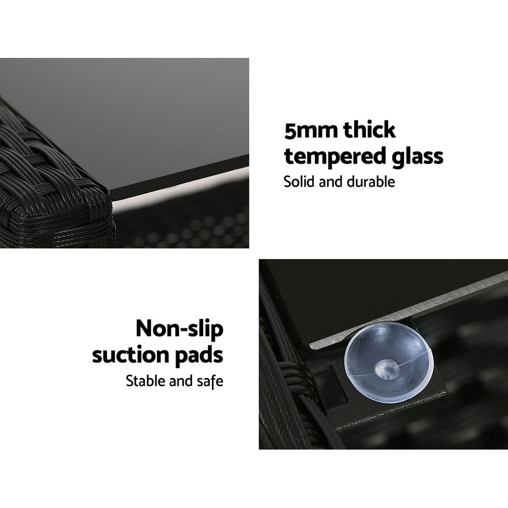 Constructed from handwoven UV-resistant PE wicker and a sturdy galvanised steel frame, it’s made to withstand the elements year-round. The 5mm tempered glass table includes non-slip suction pads for added stability. Meanwhile, the thick cushions and pillows deliver superior comfort, with removable and washable covers for easy upkeep.