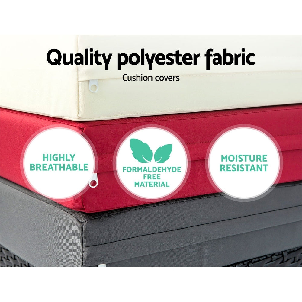 The lounge features four adjustable backrest positions and can be laid flat for a full recline. It comes complete with three interchangeable cushion cover sets (Beige, Grey, Red), so you can switch up your outdoor style anytime. Built with galvanised anti-slip plastic feet, it's stable, stylish, and suited for all-season use.