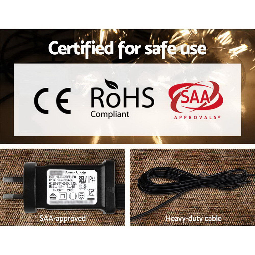 Built for year-round use, the IP44 water-resistant rating ensures reliable performance in any weather. With a low voltage design and SAA-certified plug, it’s also safe and energy-efficient. Each LED bulb is spaced 90cm apart for consistent illumination, with a 20,000-hour lifespan that lasts for many celebrations to come.